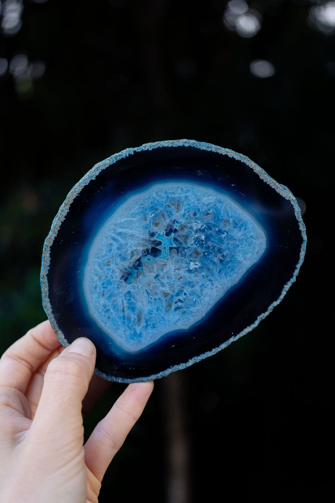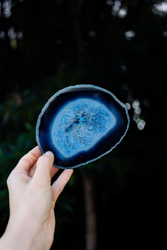 A vibrant slice of semi- transparent blue Agate to be displayed upright to capture light or as a base for another crystal, jewellery or to hold a warm cup of tea. Agate is a wonderful gemstone for balancing the mind, body, and spirit as well as helping you to slow down and centre yourself. Each slice is totally unique and will bring a touch of healing serenity to your space.