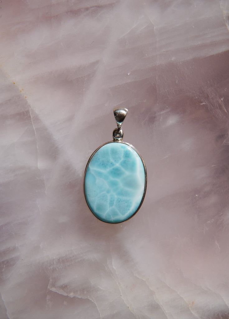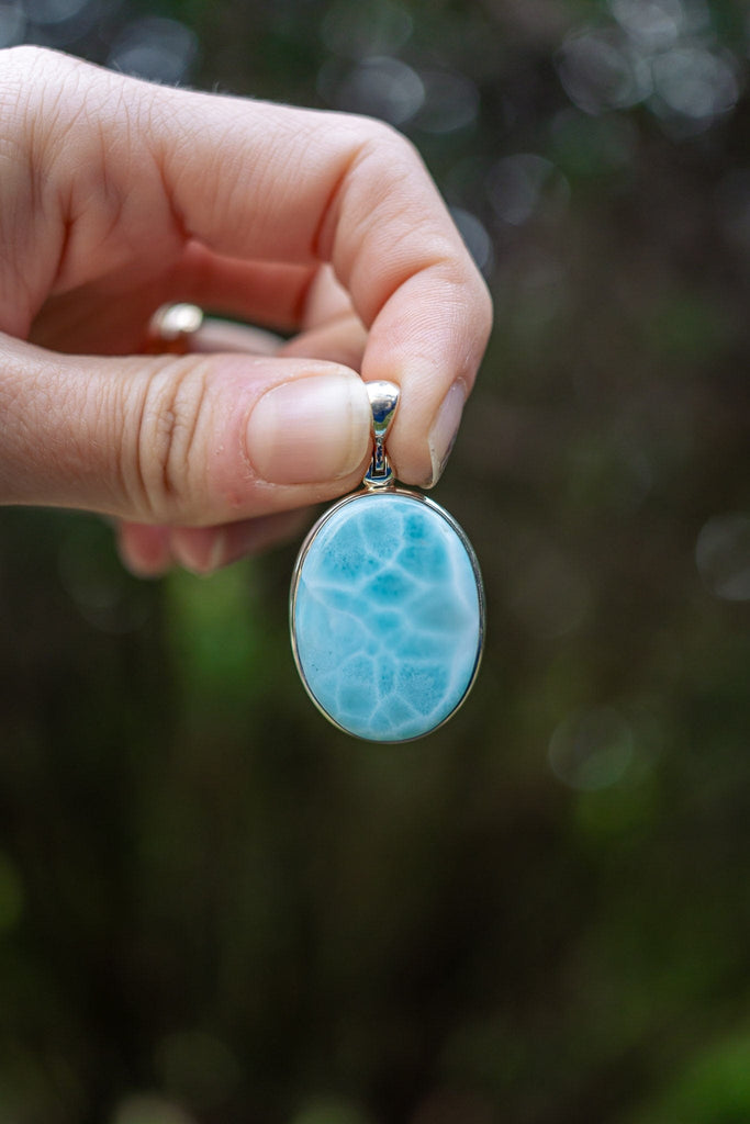 A beautiful Larimar (Dolphin Stone) pendant encapsulated in a solid 925 sterling silver setting. Larimar crystals have soft-hued blue tones marbled with pearly whites and will bring the beholder tranquillity and soothing support. Larimar is believed to be a calming crystal and promotes deep relaxation.