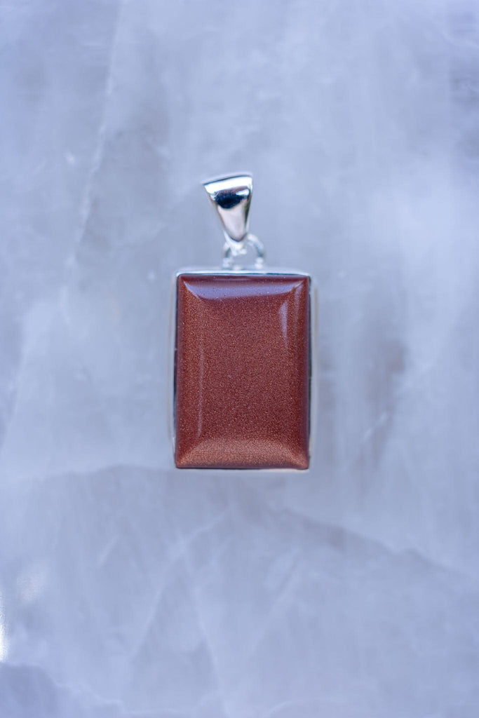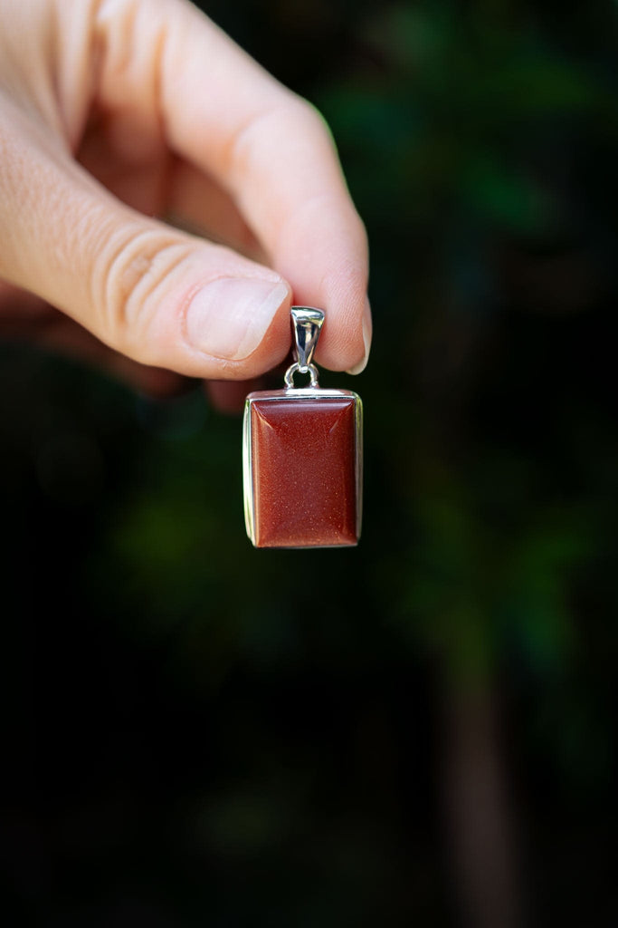 This pendant features a sparkling square of Red Goldstone in a simple 925 Sterling Silver setting to create this lovely piece. The angular cut of this Gold Stone makes for an unusual and striking pendant. Red Goldstone is said to bring luck and good fortune to the beholder, making it a fortuitous addition to any jewellery collection.