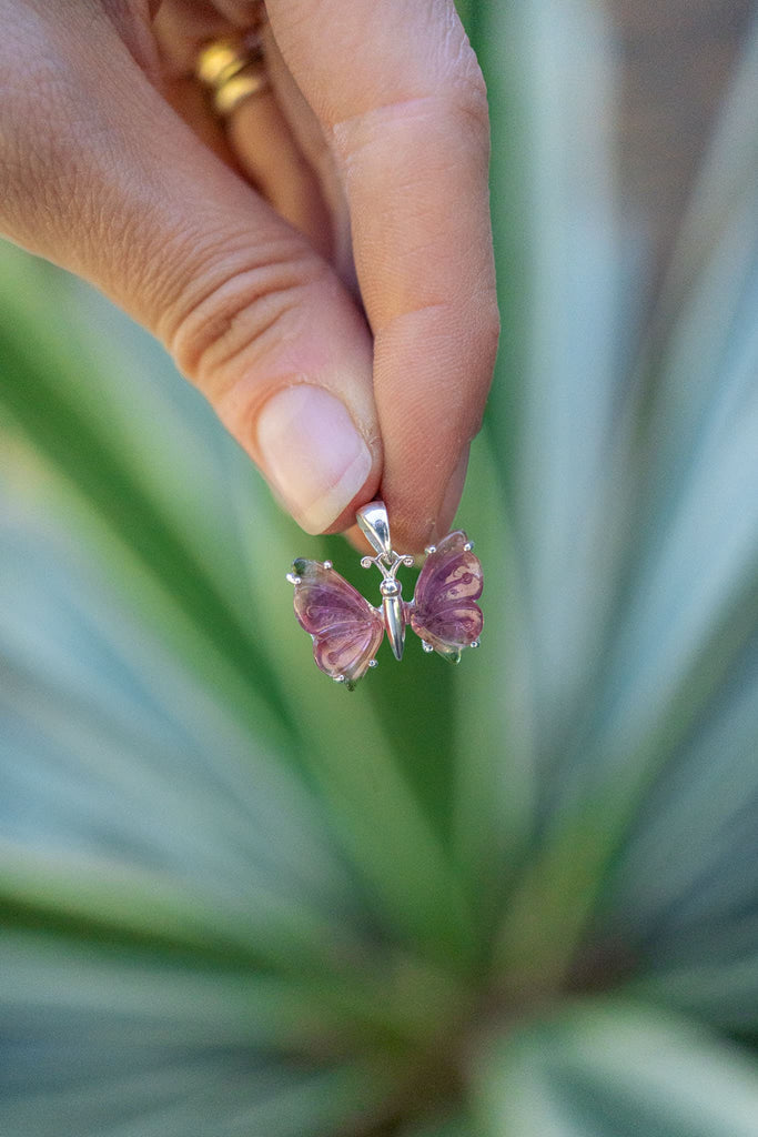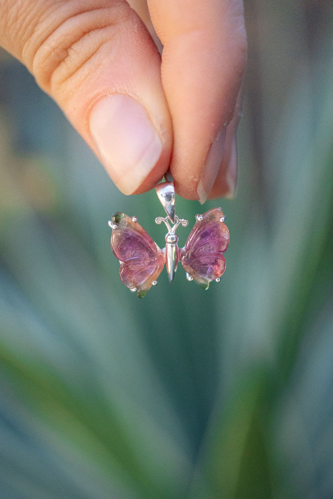 Delight in this stunning Watermelon Tourmaline butterfly pendant with its soft pink and green hues, it sits in an elegant 925 Sterling Silver setting. Watermelon tourmaline is said to symbolise tenderness and give support in the realms of friendship and love.